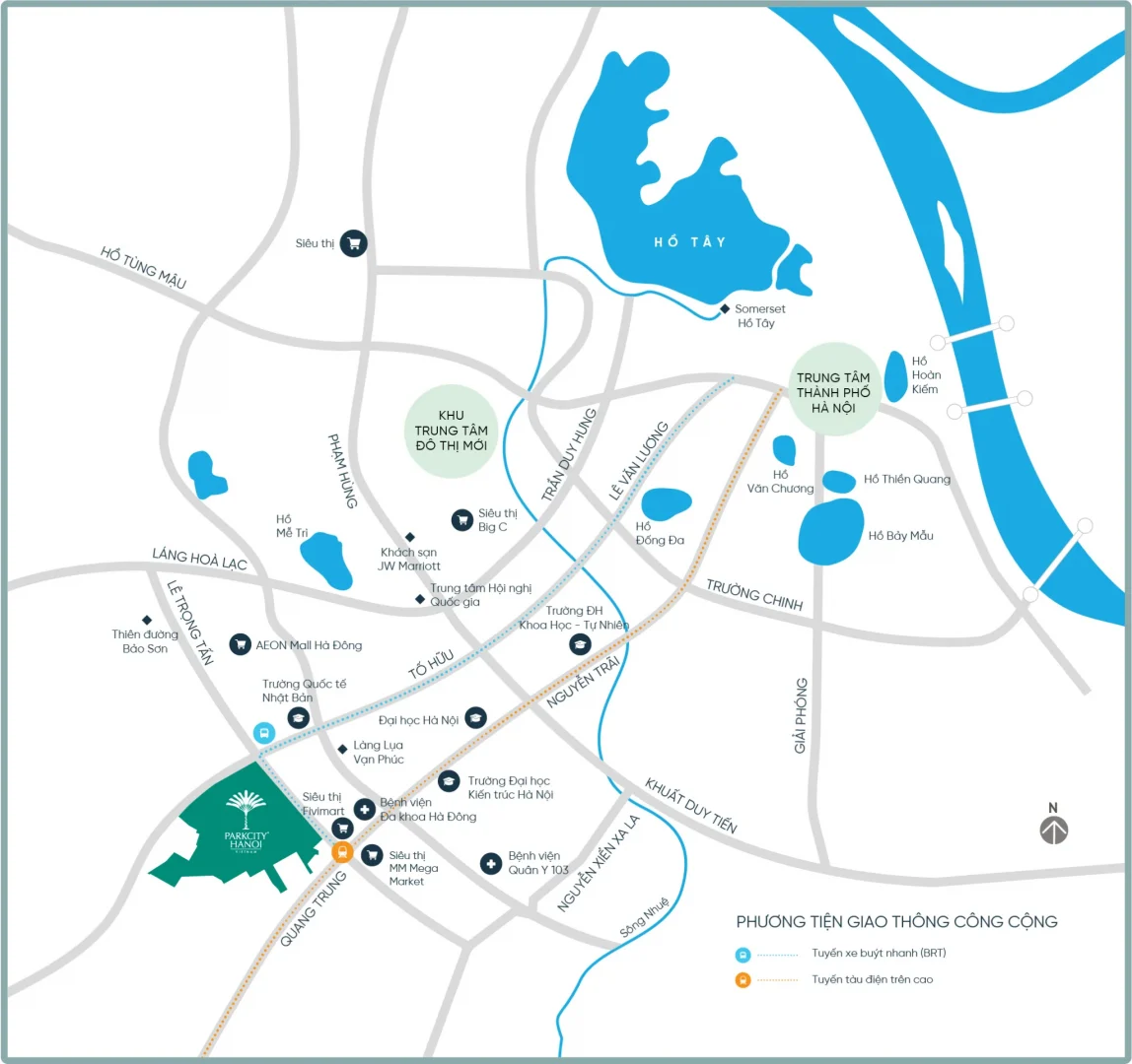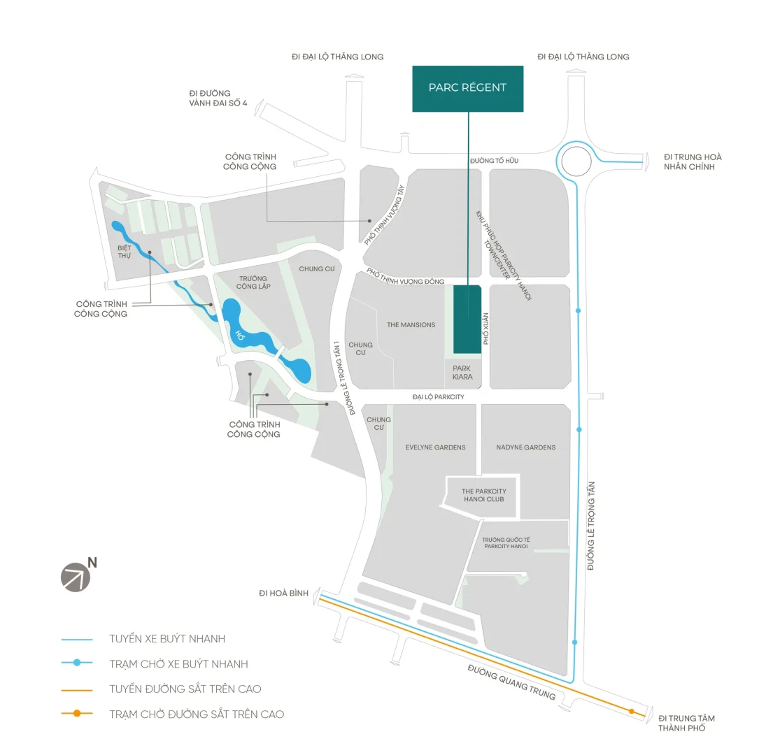 Parc Regent Hà Đông được bao quanh bởi hệ thống giao thông hiện đại, giúp cư dân di chuyển dễ dàng đến các khu vực trọng điểm: